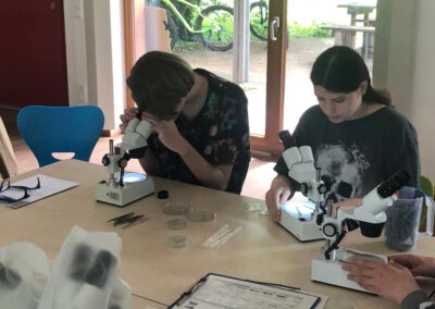 Wir haben einen netten Mann namens Daniel getroffen, er hat uns zur Erft gebracht. Hier haben wir kleine Fische und kleinste Lebewesen gefangen, z.B. den Bachflohkrebs. Wir haben uns alles mit dem Mikroskop angeguckt, um festzustellen wie viele Beine die gefundenen Lebewesen haben. Wir haben ihren Namen bestimmt, sie dann sortiert und am Ende gezählt. Damit konnten wir die Wasserqualität der Erft bestimmen. Sie ist gut.