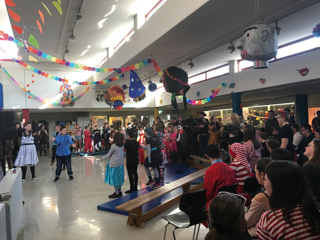 Das anschließende Karnevalsprogramm hatte viel zu bieten; angefangen vom Maccarena- und Affentanz, zum Sketch von Aschenputtel und dem Prinzen, bis hin zur Reise nach Jerusalem und einem Kostümwettbewerb. Ein mutiger Karaoke-Song, vorgetragen von drei Schülerinnen, ein Diabolo-Auftritt sowie weitere Tanzauftritte rundeten das bunte Programm ab. Zum Schluss mussten sich drei Lehrergruppen beim Musikerkennungsspiel „Hast du Töne“ batteln.