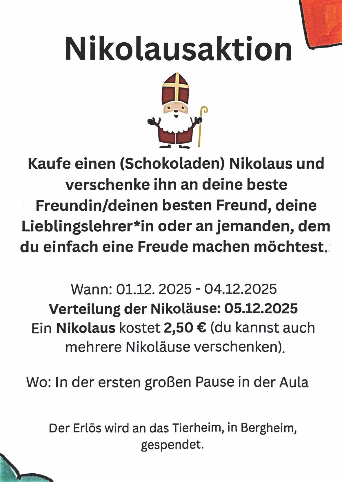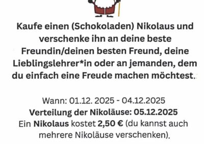 Vom 1. bis 4. Dezember könnt ihr in der großen Pause für 2,50 € leckere Schoko-Nikoläuse kaufen und sie an eure Freunde, Freundinnen oder Lehrer und Lehrerinnen verschenken.