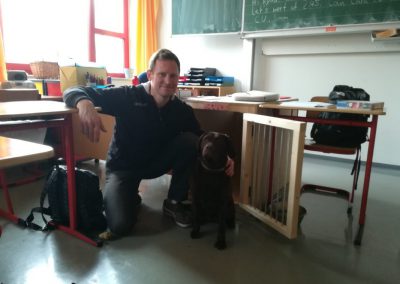 Paula, unser Schulhund ist ein besonders ausgebildeter Hund, der mit dem Lehrer und Hundeführer Herrn Schneider dreimal in der Woche zur Schule kommt. Paula ermöglicht den Schülerinnen und Schülern Erfahrungen im Umgang mit einem Hund zu sammeln. Wenn Paula in der Klasse anwesend ist, können manche Kinder besser arbeiten. Auch tröstet er bei Kummer und beruhigt bei Krisen. Trotz großer Freude gibt es auch Verhaltensregeln im Umgang mit Paula, an die sich alle Schülerinnen und Schüler sowie alle Mitarbeiter der Schule halten müssen. Von Seiten der Schulleitung werden letztendlich auch die Aspekte der Hygiene, der Sicherheit und des Tierschutzes berücksichtigt.